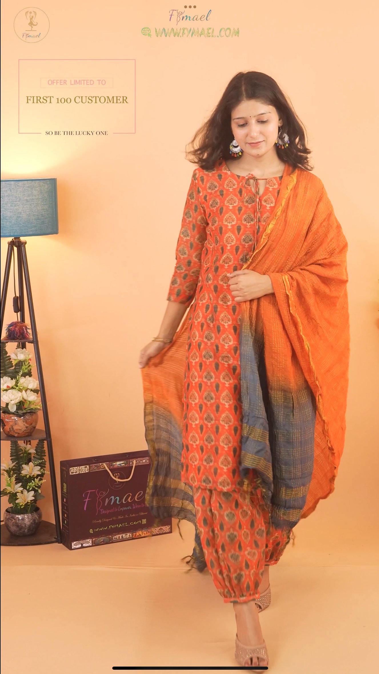 Colour Details: Bright orange base adorned with delicate traditional floral motifs in muted earthy tones, complemented by a textured silk-blend dupatta featuring a subtle gradient pallu and fine woven detailing